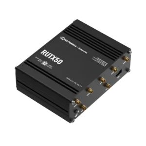 A Teltonika RUTX50 egy robusztus ipari 5G router, amely 5x Gigabit Ethernet porttal, WiFi-vel, Dual-SIM-mel, GPS-szel, nagy teljesítményű CPU-val és RutOS szoftverrel rendelkezik a fejlett hálózati megoldásokhoz.
