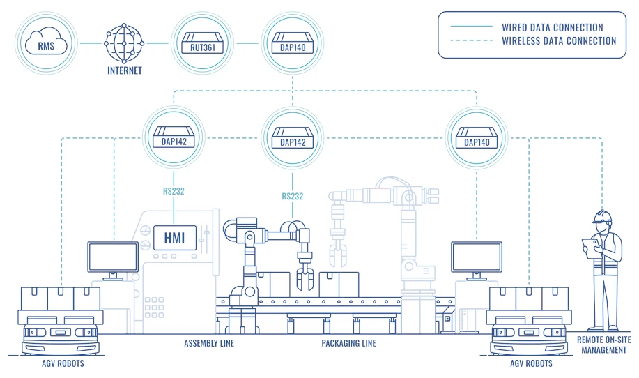 The RUT361 router is connected to a Teltonika DAP140 access point by wire via its RJ45 connector. From there, this access point communicates wirelessly with a fleet of additional access points located in the facility, which consists of various DAP140, DAP142, and DAP145 devices. The access points communicate both wirelessly and via a serial port connection with the endpoint units, resulting in a robust network. This is due to the fact that each WiFi access point supports 50 industrial connections at the same time mainly transmitted small data packets.